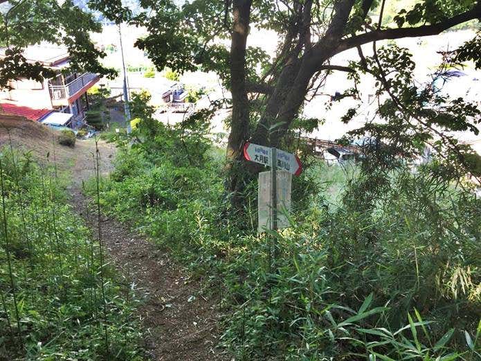 分岐にはしっかりとした標識があるので、自分の下りたい駅の方向に進みましょう。田野倉駅に下るコースは2つあります。今回は、大月駅に下るので、おむすび山方面へ進みます。