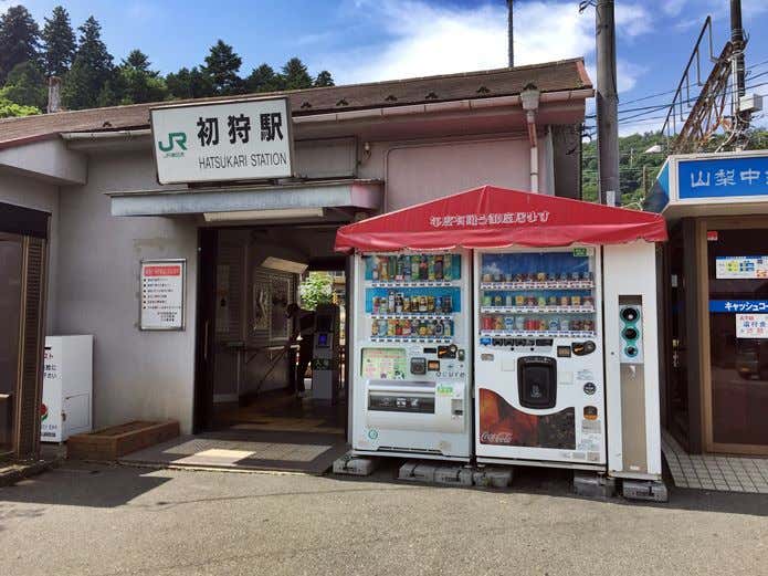新宿からJR中央線で約1時間30分~2時間で到着。無人駅の初狩駅には、駅構内にトイレがあるので、改札を出る前にトイレを済ませましょう。周辺にはコンビニエンスストア(20号沿い)もあるので、必要な食料や水も購入できます。