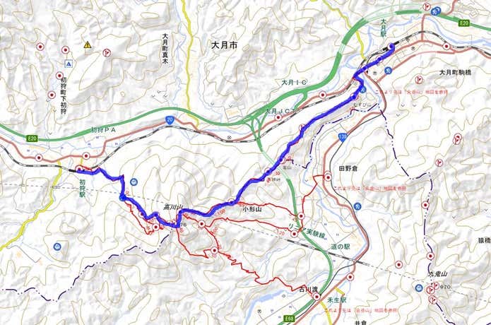 高川山への登山コースは、複数ありますが、今回は、JR中央線初狩駅から入山し、大月駅に下るコースをご紹介します。初心者でも歩けるルートですが、体力に自信がない場合は、往路を下山するか、田野倉駅へ下山するコースがよいでしょう。