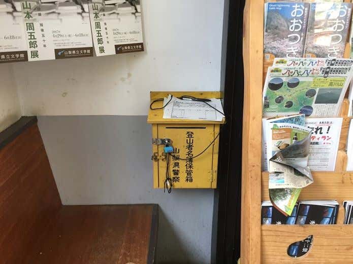 改札を出ると、パンフレットが置いてある棚の横に登山届けを入れるポストがあるので、必要事項を記入して提出しましょう。山梨警察では、高川山には、獣道も多くあり道迷いが発生しているので注意を促しています。