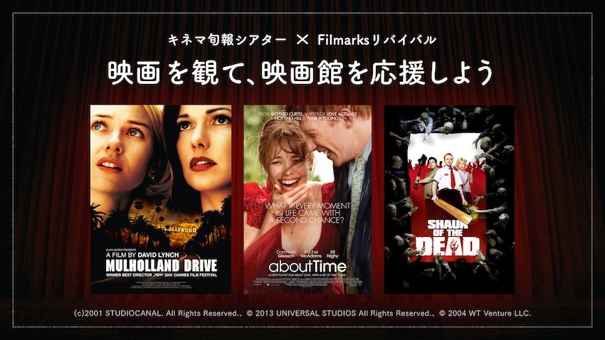 レビューサービスのFilmarksはリバイバル上映プロジェクト〈Filmarksリバイバル〉にて、老朽化した設備の改修に向けてクラウドファンディングを実施中のキネマ旬報シアターを応援すべく、「マルホランド・ドライブ 4Kレストア版」(2001)「アバウト・タイム 愛おしい時間について」(2013)「ショーン・オブ・ザ・デッド 4K」(2004)の3作を同館で12月6日(土)より順次上映する。