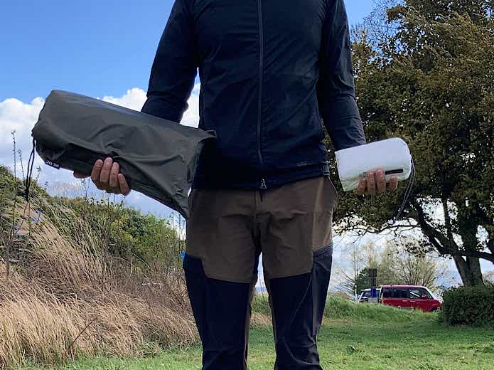 表地+防水透湿素材の2層構造で、薄い作りになっているため携行性が高く、シュラフ内に入ったときも体勢を変えたり、寝返りを打ったりしやすいというメリットがあります。