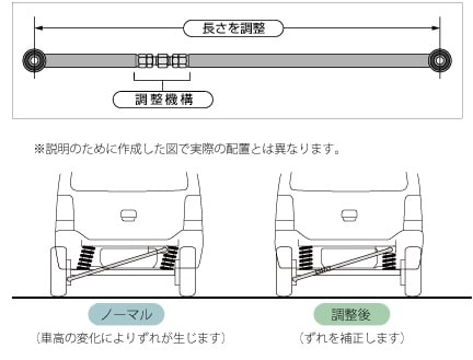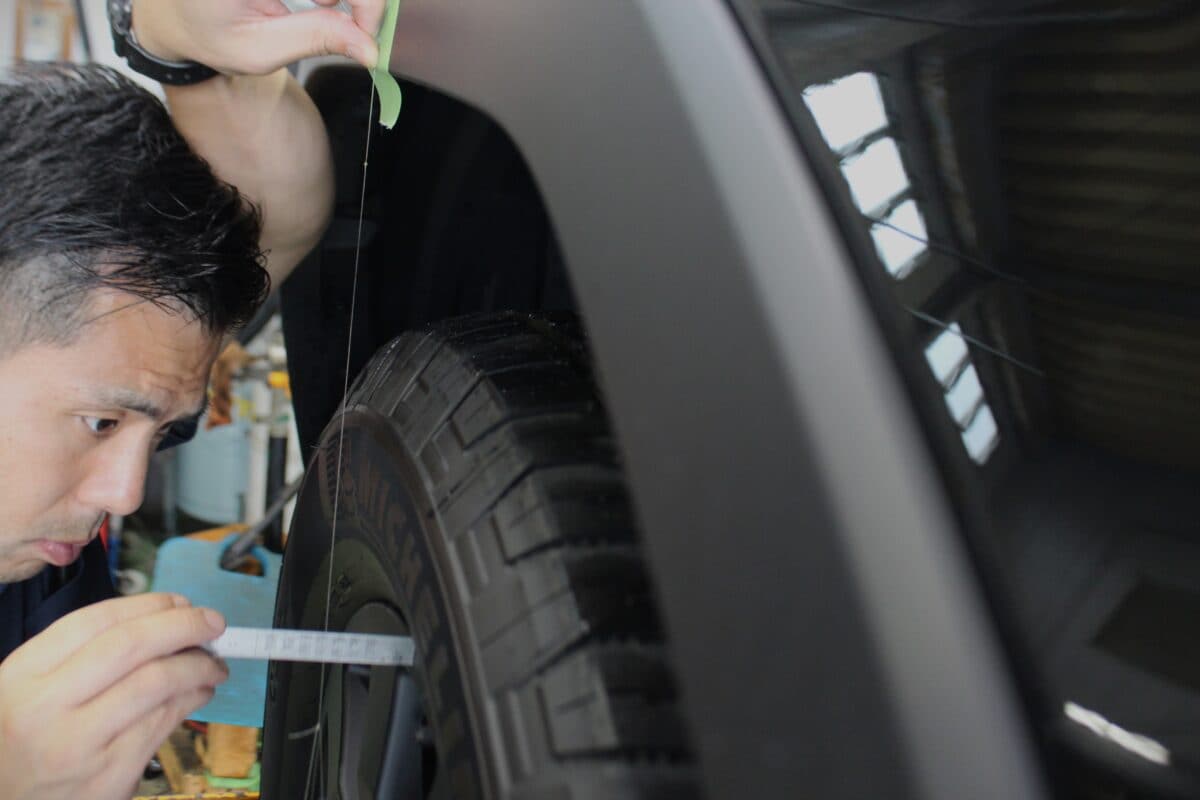 また、リフトアップに伴う「ラテラルロッド調整」も重要な工程。糸にオモリを垂らしてタイヤの出幅を測定し、サスペンション軸のズレを補正することで、左右の出幅を均等に整える。アライメント調整と合わせてきめ細かく調整するこの作業は、人間でいう骨盤矯正のようなモノで、同店が得意とする分野だという。こうしたドライバーの好みに合わせたベストセッティングを追求する姿勢が、多くのリピーターや紹介客を生んでいる。