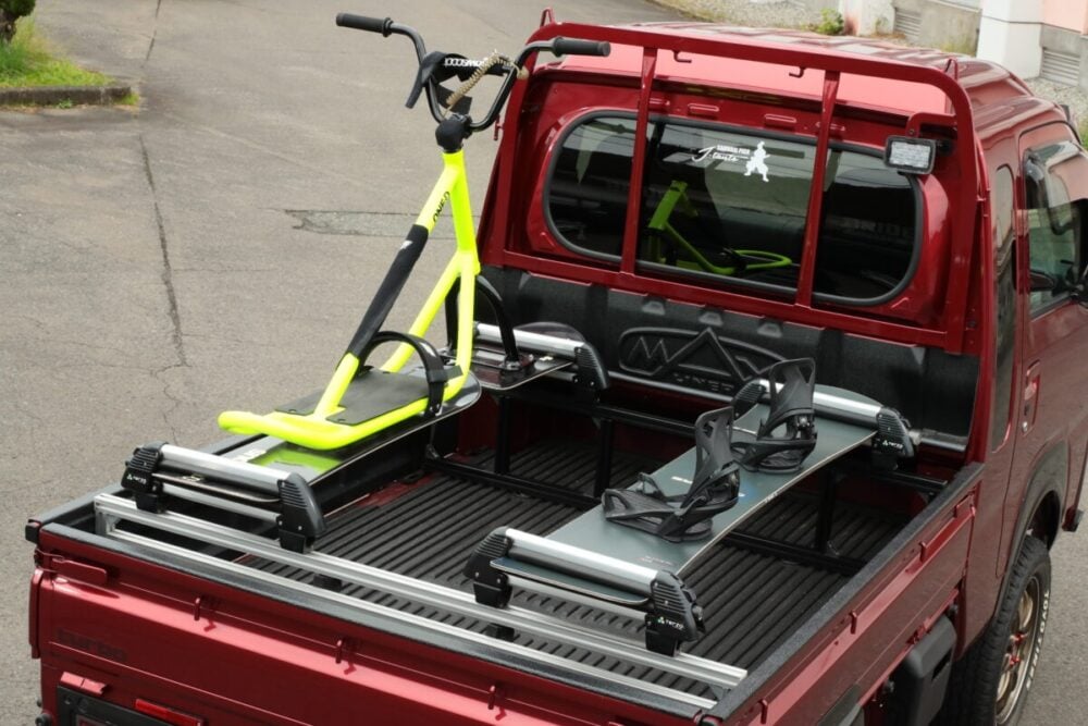 アタッチメントを取り付ければ、軽トラの荷台にスキーやスノボ、自転車も楽々積み込める!