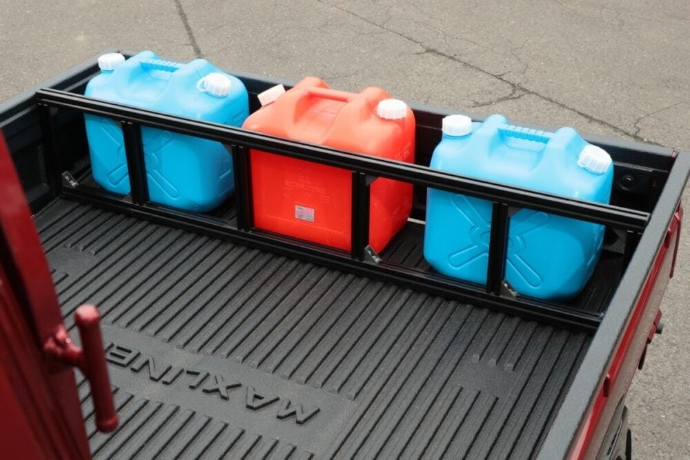 前方から見た状態。スッキリとポリタンク3つが収納できる。荷台セパレーターの前方に空間がしっかりと確保され、その他の荷物もしっかりと搭載できるのもいいところ。