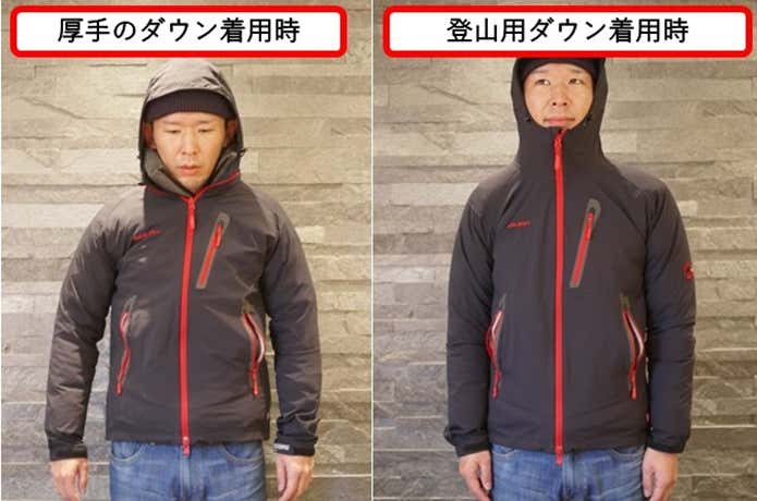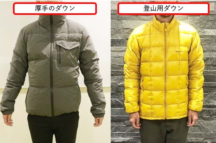 基本的にダウンは綿毛をたくさん使用していて、分厚いもののほうが保温力が高くなります。そのため、山でも分厚いダウンを着ている人を見かけます。