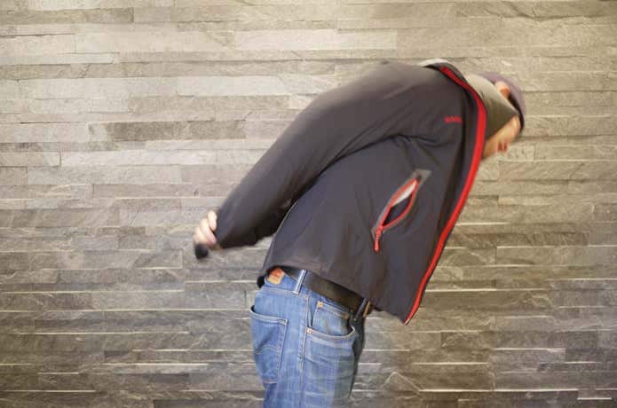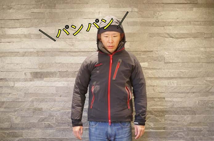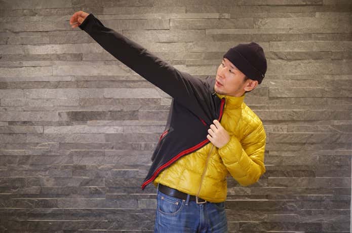 分厚いダウンを着た時に一番感じたのが、腕や脇周りの苦しさ。とてもウェアが脱ぎづらく、1分くらいジタバタして、ようやく脱げました。