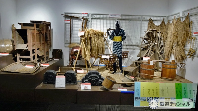 一番奥に農機具などが展示されています。手前には鬼瓦。