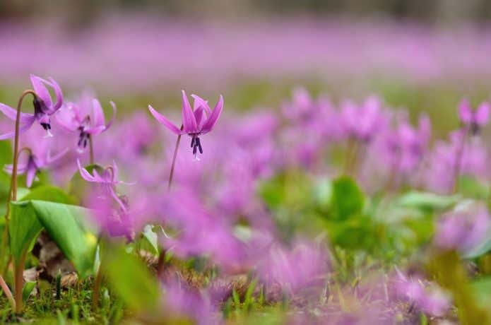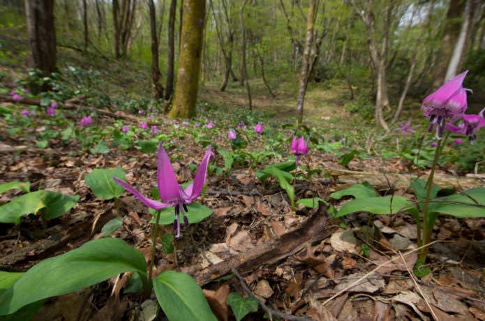 御前山のカタクリは年によって差がありますが、4月下旬から5月上旬にかけてが見ごろです。開花時期が短いことから春の妖精とも呼ばれています。惣岳山から御前山へ向かう登山道の脇からカタクリが見られはじめ、保護ロープの中では群生を見ることができます。