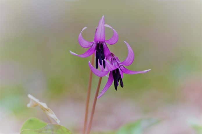カタクリはユリ科カタクリ属に属する多年草で、山野の涼しく日当たりの良い場所を好みます。早春に斑の入った葉と花茎を出し、地上に出て10日ほどで淡い赤紫色の可憐な花を咲かせ、初夏には葉がなくなり9月末まで休眠し、10月から発根し始めます。発芽から開花には7、8年かかります。