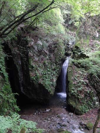 栃寄大滝は岩の上を滑るように流れる長い滝です。滝を過ぎると急な岩の道となり、大きな岩の割れ目を流れる滝やワサビ田を経て林道へ出て境橋へ至ります。