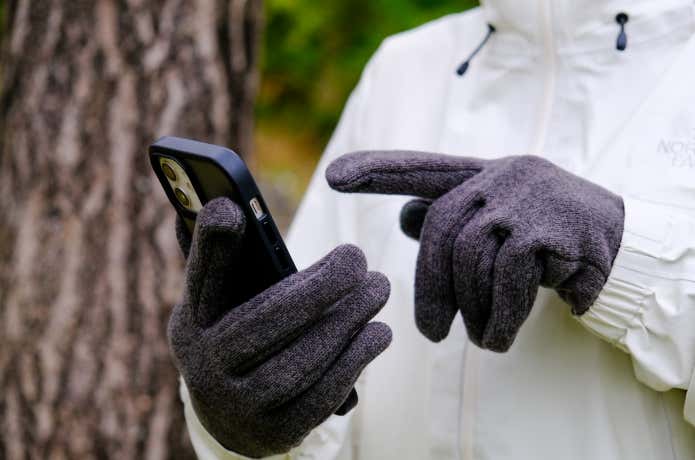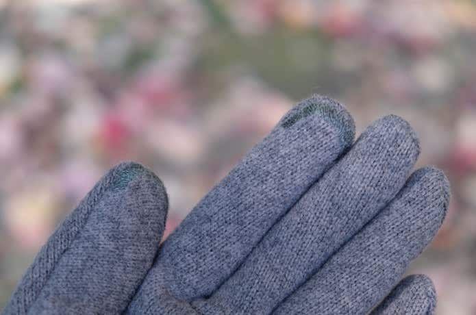 親指と人差し指の先に“導電性素材”が使われており、スマホ操作に対応しています。