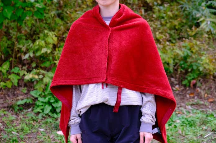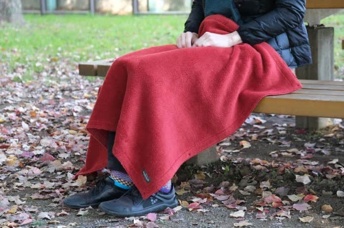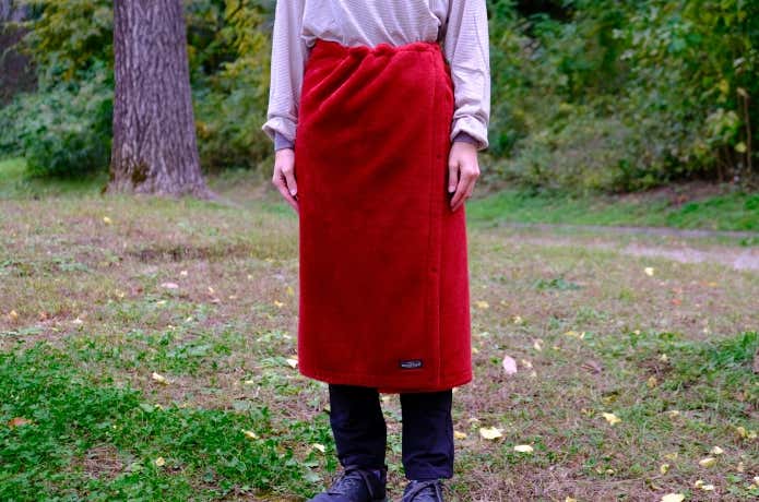 そして、3WAYで使えるところも便利。ひざ掛けとしてだけでなく、スナップボタンを留めてマントのように羽織ったり、ドローコードを絞ってスカートのように腰に巻いたり、使い方は自由自在。