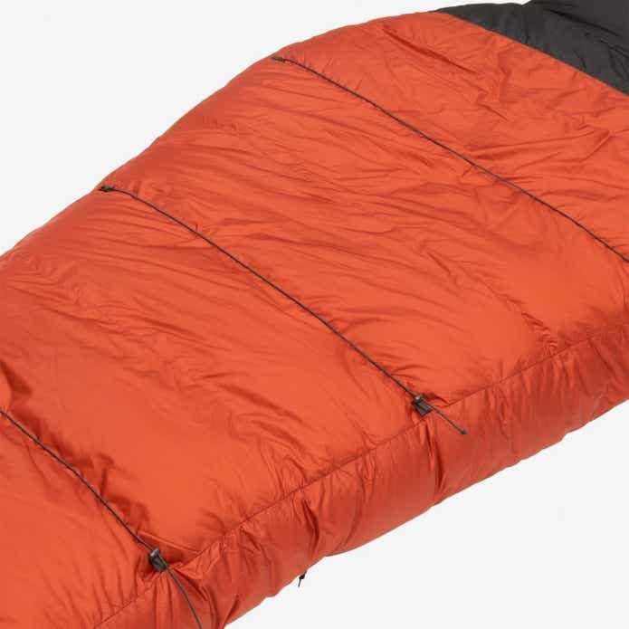 さらに、体重がかかった状態でもダウンが潰れにくい構造を採用することで、冷気の侵入を抑えてくれます。背面にはスリーピングマットと連結できるショックコードも備えており、寝返りを打ってもズレにくい仕様です。