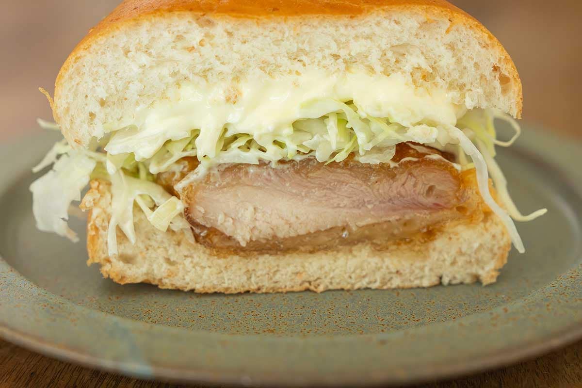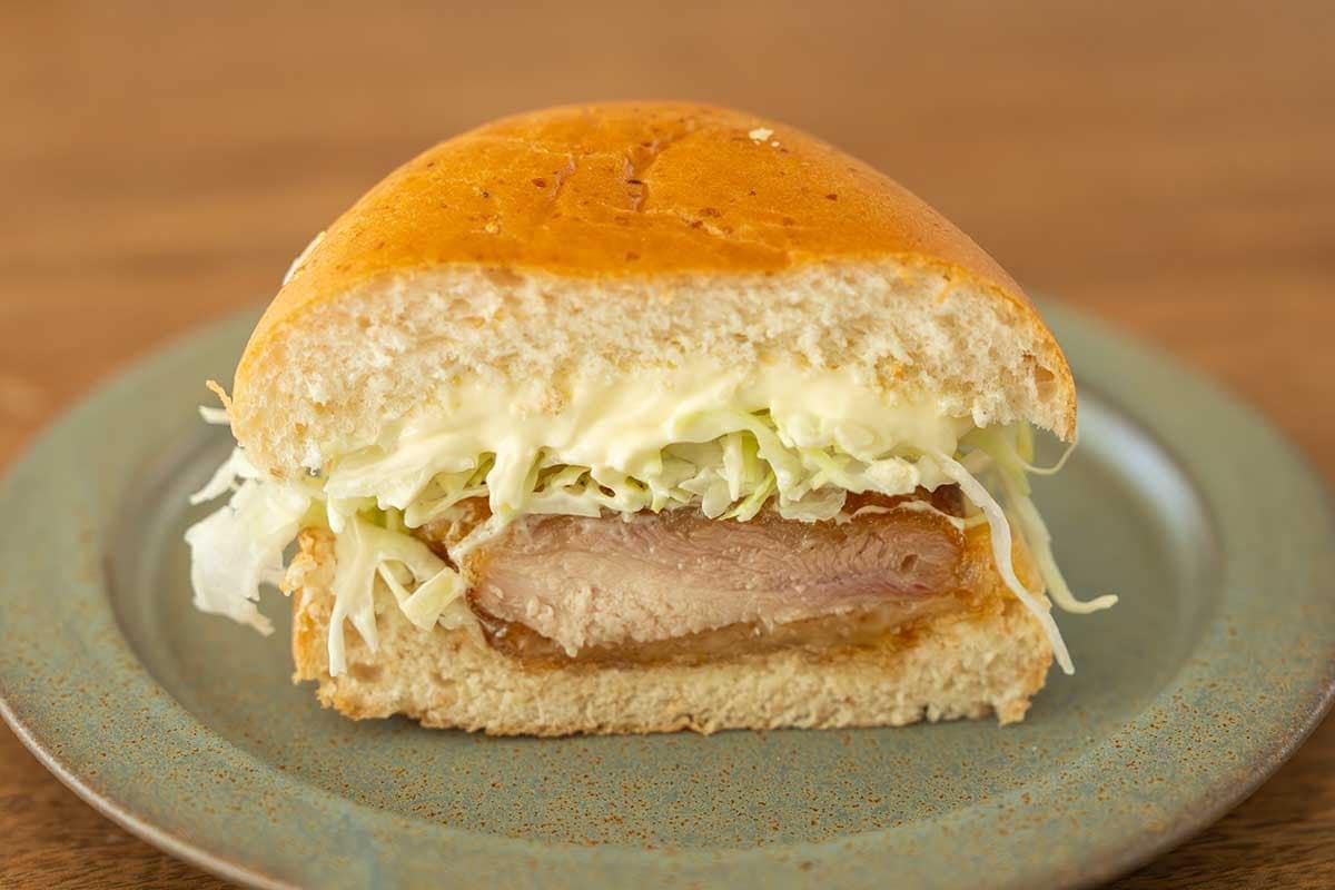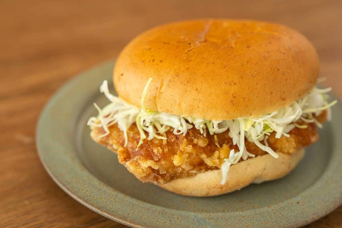 大きな竜田とたっぷりの千切りキャベツがサンドされているので、バンズから具材がはみ出しています。