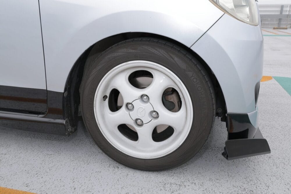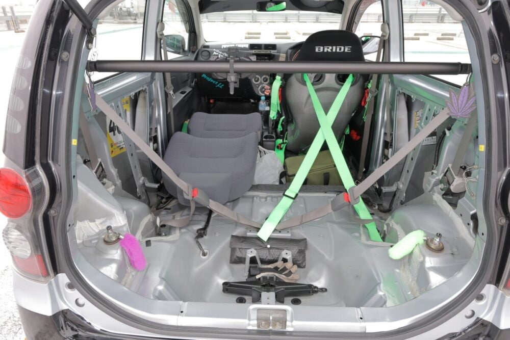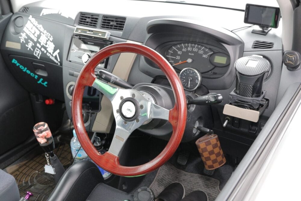 ブレーキはキャリパーもローターも初代コペンから流用。ローター径がワンインチアップの13インチ「になっているはず! うろ覚えなんですけど」とのこと。なんと無加工で入れ替えられるそうだ。