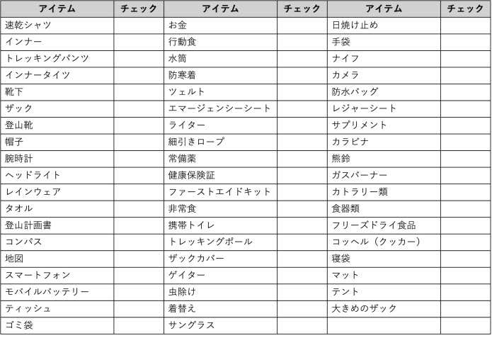 初心者にありがちなのが、いざ使う時に”ない”と焦るパターン。せっかくの登山でテンションを下げないように、忘れ物のチェックは必ずパッキング(荷物をザックに入れる)前にする習慣をつけておくと安心です。チェックリストを用意したので活用してみてください。