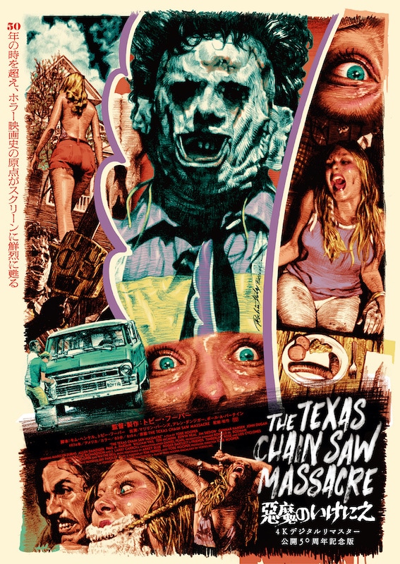 トビー・フーパー監督によるスラッシャー・ホラーの金字塔「悪魔のいけにえ」(1974)が、“4Kデジタルリマスター 公開50周年記念版”となって1月9日(金)より新宿ピカデリーほか全国で公開される。ティザービジュアル(Rockin’Jelly Bean(ロッキン・ジェリー・ビーン)のイラストをもとに大島依提亜がデザイン)と、タランティーノおよびスピルバーグのコメント入り予告編が到着した。
