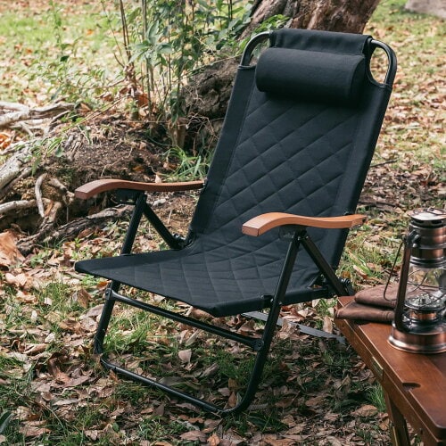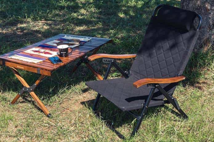 エルゴノミクス設計の心地よい形状や木製で優しい質感の肘置きなど、各所にこだわりが光るアイテムです。コットン生地なので肌触りがよく、難燃性が高いので焚き火をしても安心ですね。