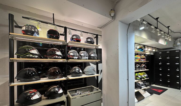 AGVヘルメットの各モデルを比較しやすい環境へと一新しています。無料駐車場に加え、近隣コインパーキングのサービスもご用意、クルマでも安心してご来店いただける環境を整えました。
