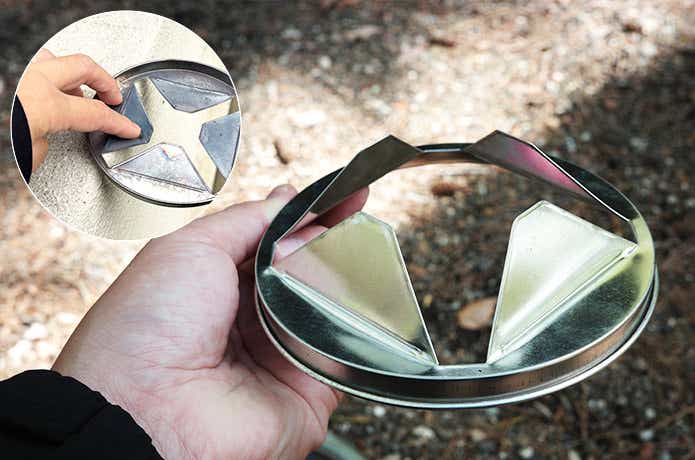 なんと十字に切れ目の入っているのが五徳! 4箇所の爪をラインに沿って折り曲げることで五徳に早変わり。手作業で行う必要はあるので、調整などは少し時間がかかります。