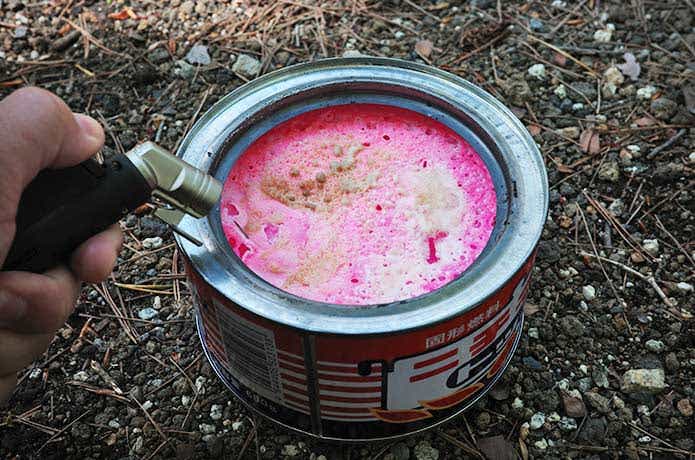 主成分は青い固形燃料と同じメタノールで、色の違いはあるものの主成分としての違いはないようです。そのメタノールを石鹸と似たような作り方で固めているのだとか。