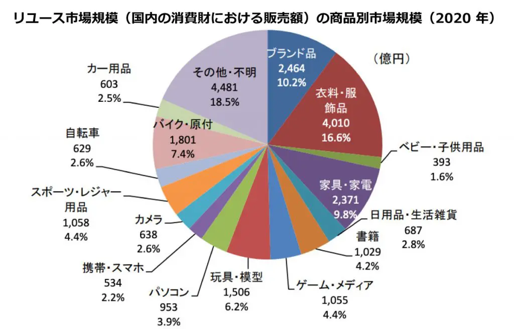 環境省の発表した「令和3年度 リユース市場規模調査報告書」によると、クルマを除くリユース市場規模は約2兆4,169億円となっており、バイク・原付は約1,801億円、7.4%に過ぎません。