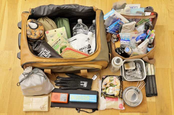 こちらが、我が家の防災バッグ。リュックにもキャリーケースにもなる2wayバッグに、水や食料、ガスなどの調理道具にマットや寝袋、救急セットなどが入っていてトータルで約14kgになります。