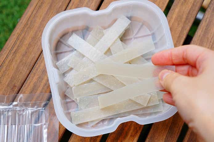 まずは白い容器に春雨をほぐして入れます。一枚一枚はがすようにパラパラとセット。