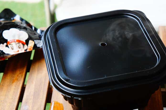 【ポイント】このとき、フタはカチッと音がするまでしっかり閉めること。フタが緩んでいると、ヒートパックの熱と圧力でふつふつと湧いてきたときに汁が溢れ出してしまうので注意。心配な方はキッチンペーパーなどを敷いておくといいかも。