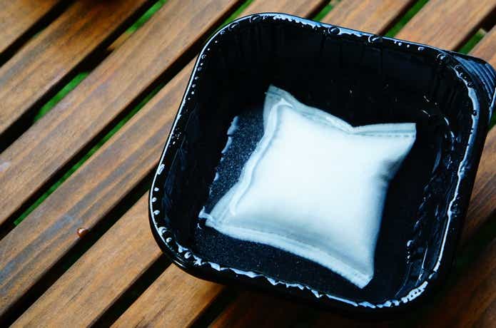 銀色の袋からヒートパックを取り出して水に浸けると化学反応が起き、水が熱湯に変化することで加熱ができるという仕組みです。つまりこれは発熱材ですね。