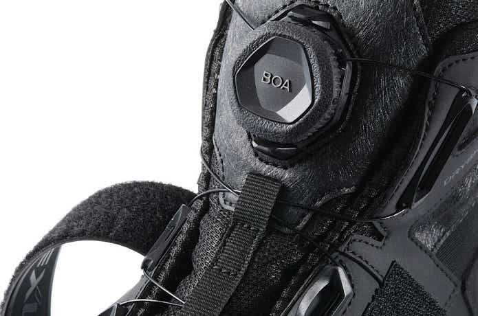 BOAフィットシステムの大型ダイヤルと太いワイヤーが、足全体を包み込むようにしっかりホールド。