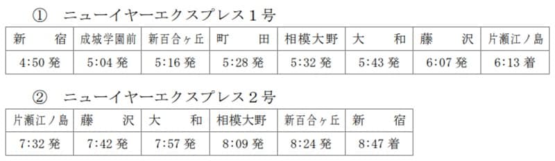 「ニューイヤーエクスプレス1号」は4:50新宿発~6:13片瀬江ノ島着。「ニューイヤーエクスプレス2号」は7:32片瀬江ノ島発~8:47新宿着となります。