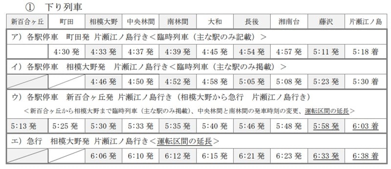 片瀬江ノ島~相模大野・藤沢間の臨時各駅停車を運転。快速急行の運転区間の延長や時刻の変更も実施します。