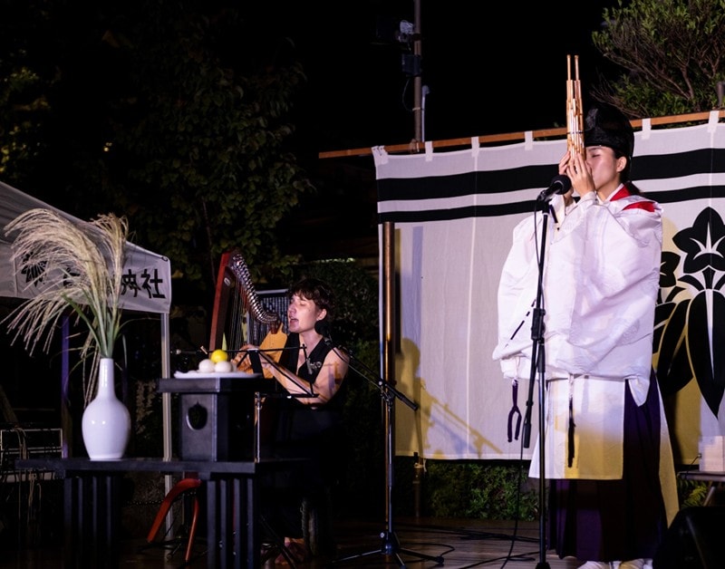 10月には神奈川県藤沢の白旗神社で、中秋演奏会に出させて頂いた。中秋の名月の日に合わせて毎年野外で夕方から開催される。その日はあいにくの曇り空。せめて音楽で月を感じましょうと、笙とハープでドビュッシーの「月の光」などを演奏した。最後はドイツ語圏で広く親しまれている「月が出た」という曲。私が笙で伴奏し、ソフィーがハープを弾きながらドイツ語で歌ってくれた。