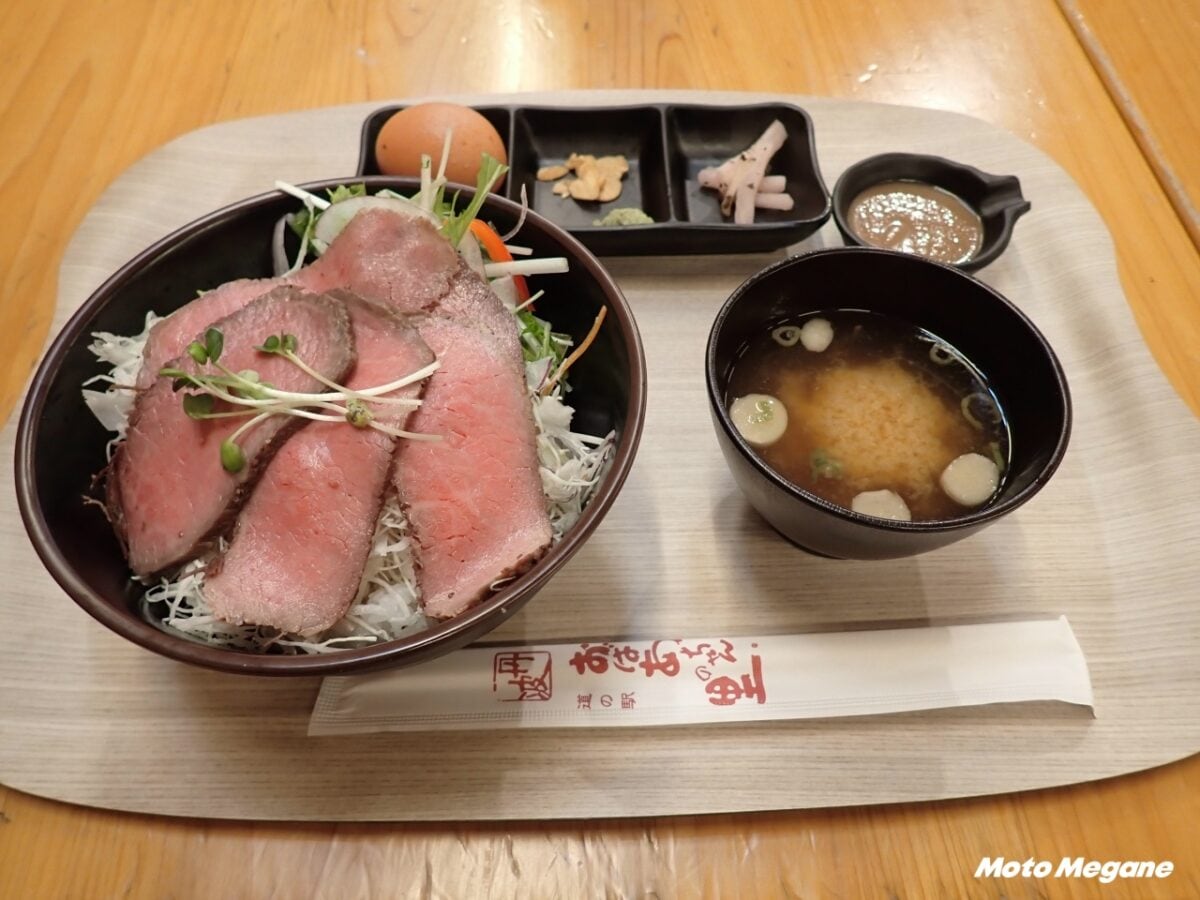 丹波市内にある髙見牧場の牛肉を使った自家製のローストビーフ丼。肉質はしっかりとしていて、赤身系の肉は旨味がたっぷり。市内にある養鶏所の玉子を使った半熟卵と相性抜群。半熟卵を絡めて食べるのがおすすめ。ソースも美味。