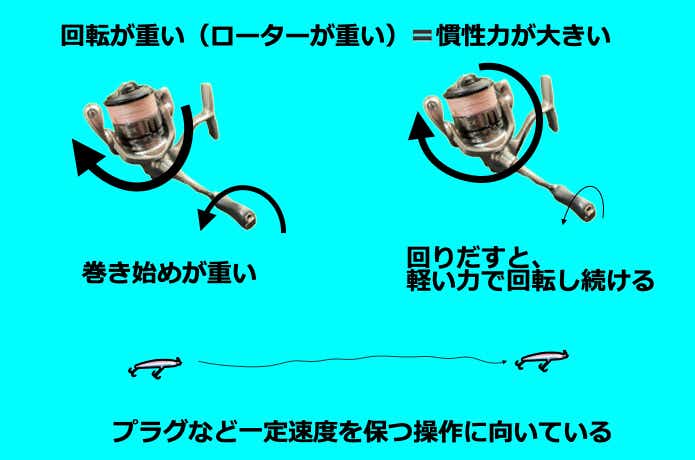 しかし、一度回り出すと慣性モーメントが働いて軽い力でも回転し続けるため、一定速度のただ巻き状態を維持しやすいことが特徴です。