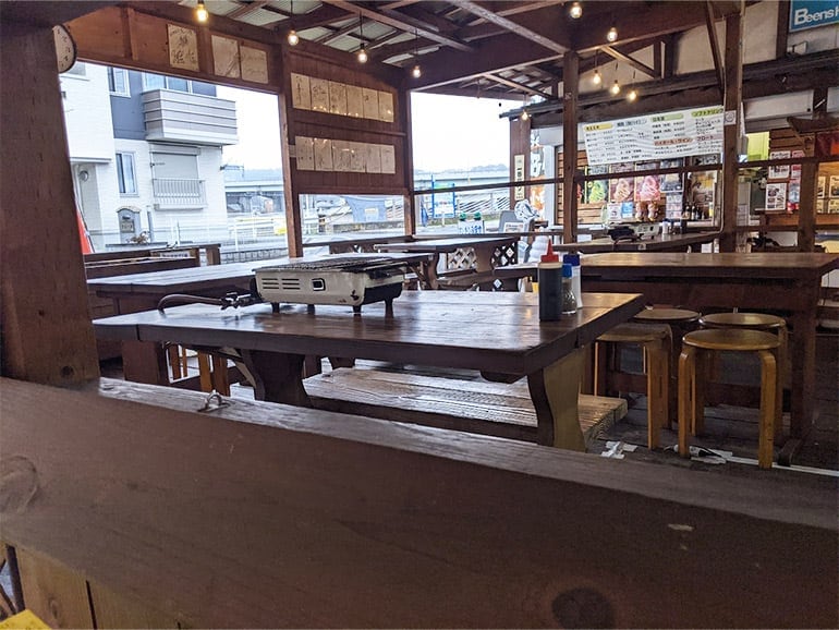 直売所の「さかなセンター」前にはウッドデッキの浜焼きコーナーがあり、店内で買った干物やエビ、貝をガスロースターでその場で焼いて楽しめます。