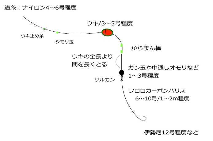 ウキ釣り仕掛けでは、エサが引っ張って沈まない程度の高浮力なウキを選ぶことが大切です。