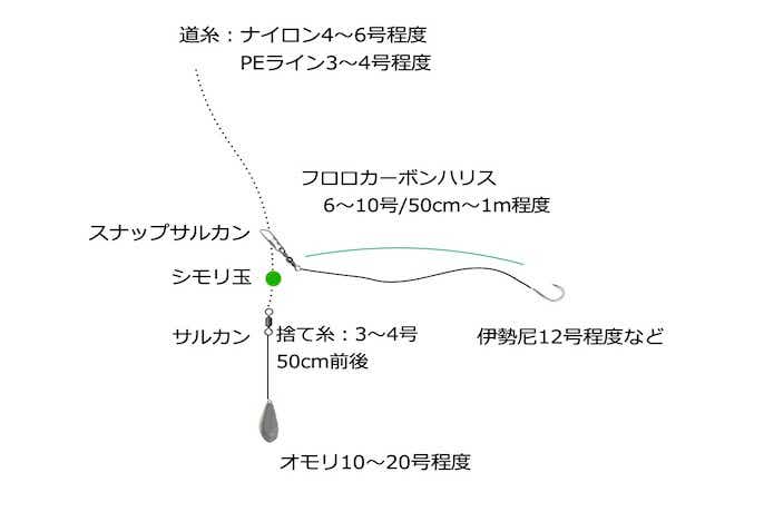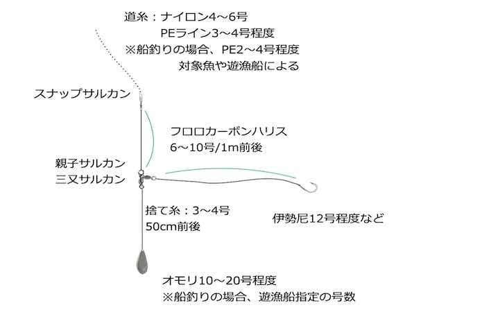 親子サルカンとオモリを用いた胴付きタイプの仕掛けです。堤防はもちろん、船でも使われます。