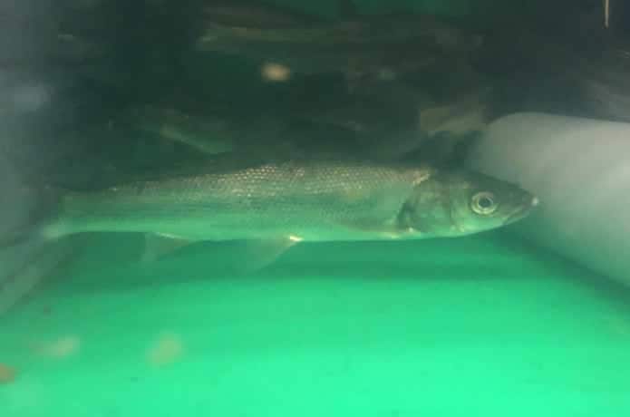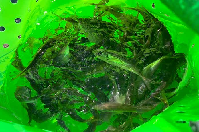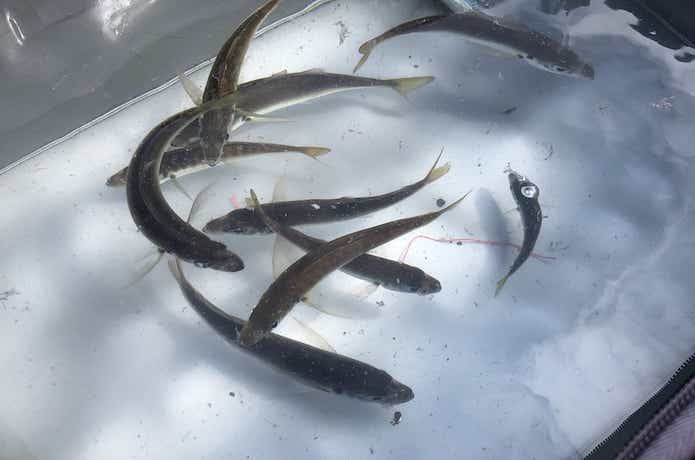 淡水魚のウグイは海水に入れても元気に泳ぐため、エサとして活躍します。