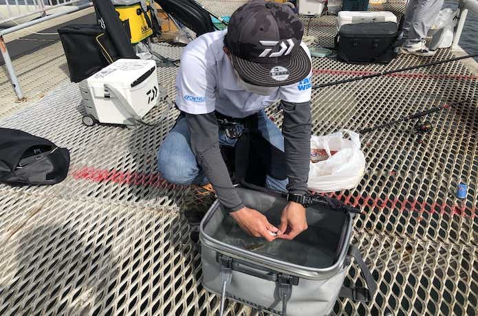 エサが弱らないようにできるだけ素早く、水中で針に掛けましょう。