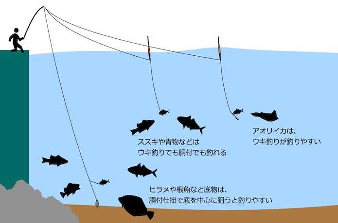 例えば、底付近を泳いでいる根魚やヒラメには胴付き仕掛け、神経質なアオリイカにはウキ釣り仕掛けが適しています。