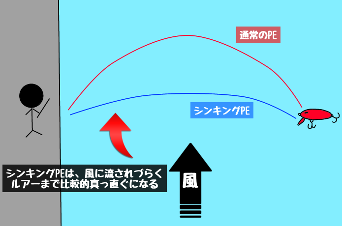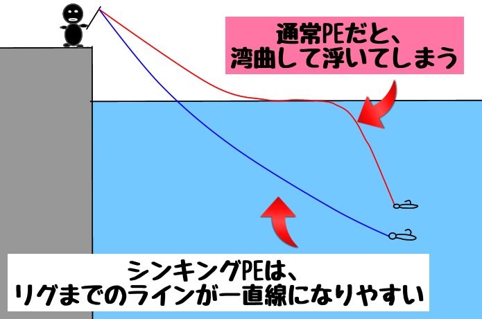 通常のPEラインは海中のリグまでの軌道が湾曲した状態になるので、遠く深くなるにつれて感度や操作性が落ちてしまいます。