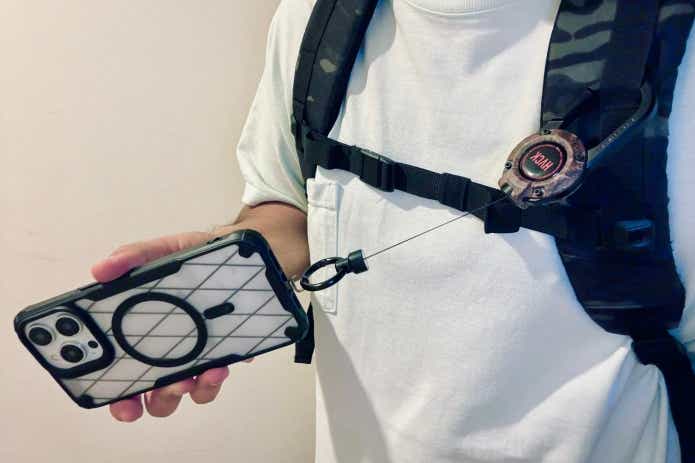 取り付けはカラビナ一発。デイパックのストラップ、ベルトループに取り付ければ、スマホや鍵をいちいちはずさなくても使え、取り回しがグッと楽に!