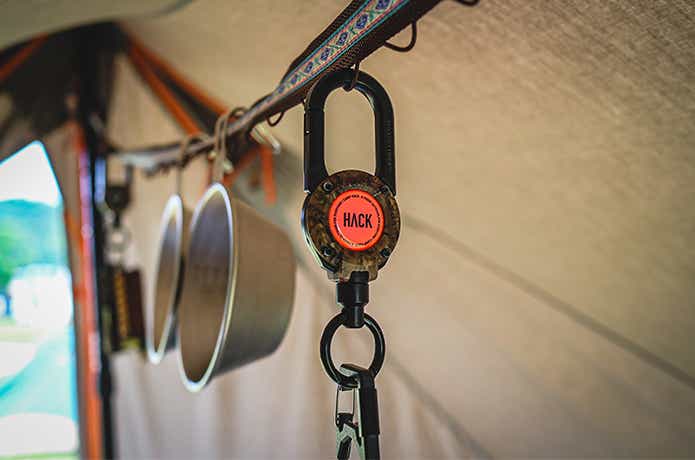 キャンプなら、ガストーチや小型ランタン、ティッシュケースをつけて、うえから吊り下げたり、コンテナやチェアに引っ掛けたり。席を立たなくても、コンテナを漁らなくても一瞬で手に取ることが可能に。
