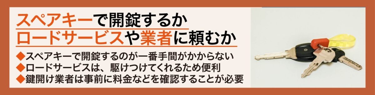 スペアキーで開錠するか、ロードサービスや業者に頼むか