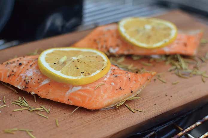 食材と板の間にレモンを敷くと、こびり付くのも防げてより美味しくなってオススメ。レモンと合うサーモンなどの魚介だけでなく、牛肉や鶏肉などにも使えます。