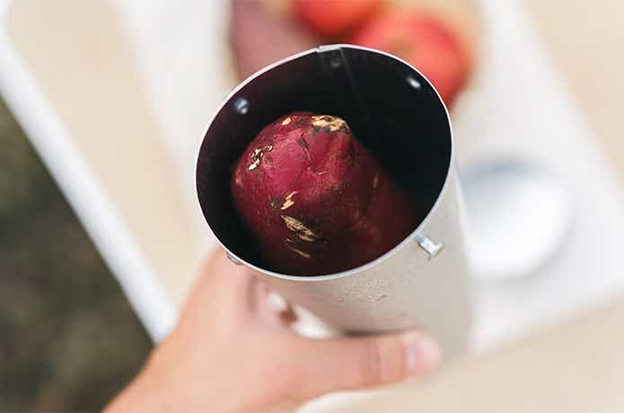 標準的なサイズのサツマイモを入れると、ジャストなサイズ感。あとは蓋を閉めて焚き火の中に放り込むだけ。