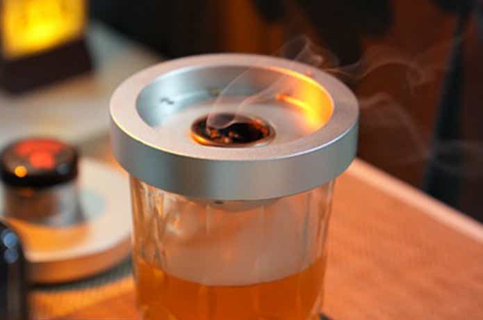 使い方はとても簡単。チップを入れたメッシュフィルターを本体にセットし、お酒の入ったグラスに乗せてバーナーなどで着火するだけ。